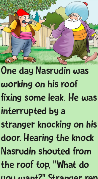 One day Nasrudin was working on his roof fixing some leak. He was interrupted by a stranger knocking on his door.